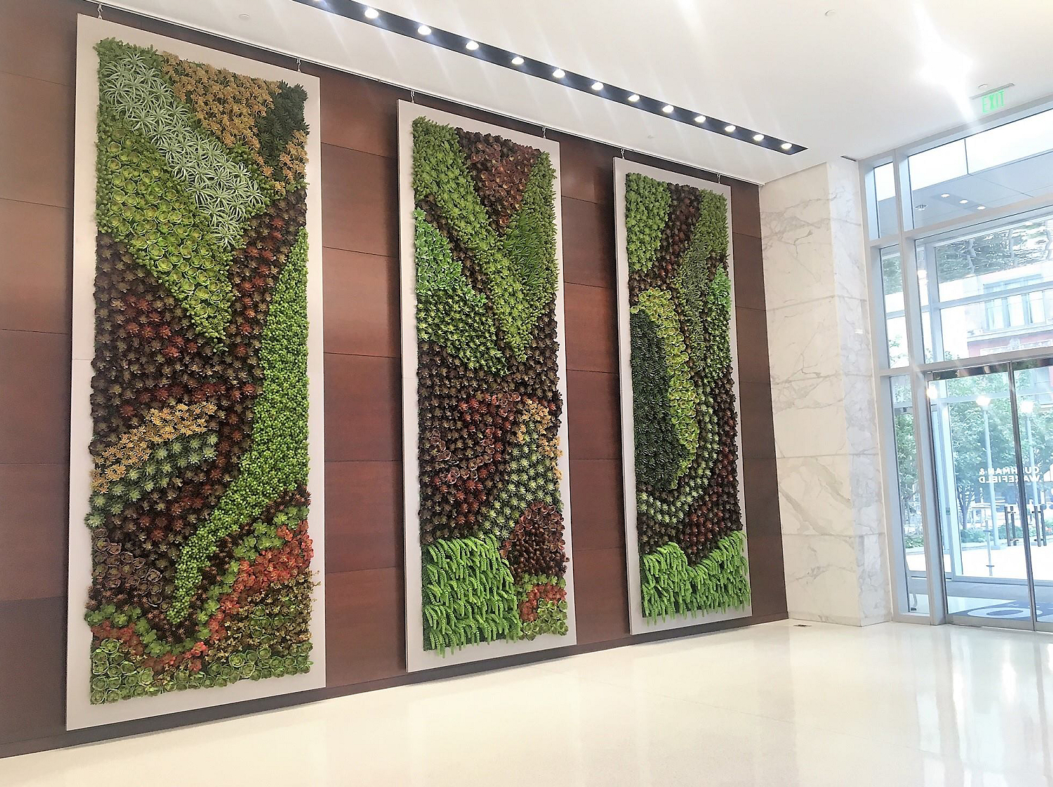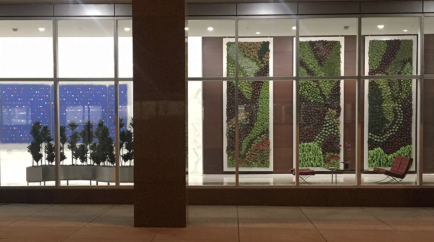 We fabricated three 16-foot-tall panels using a rich mix of green and burgundy faux echeveria, agave, sedum, and other textured succulents for the main lobby, along with a smaller matching panel near the elevators. Because the panels couldn’t be wall-mounted, we engineered custom ceiling-suspended frames with cable support and hardware that blended seamlessly with the panels’ silver PVC trim. The finished installation created a striking street-visible display that delighted both Ventura and his client. “In person, the lobby panels are even more impressive - especially in the evening!” he shared after the installation.