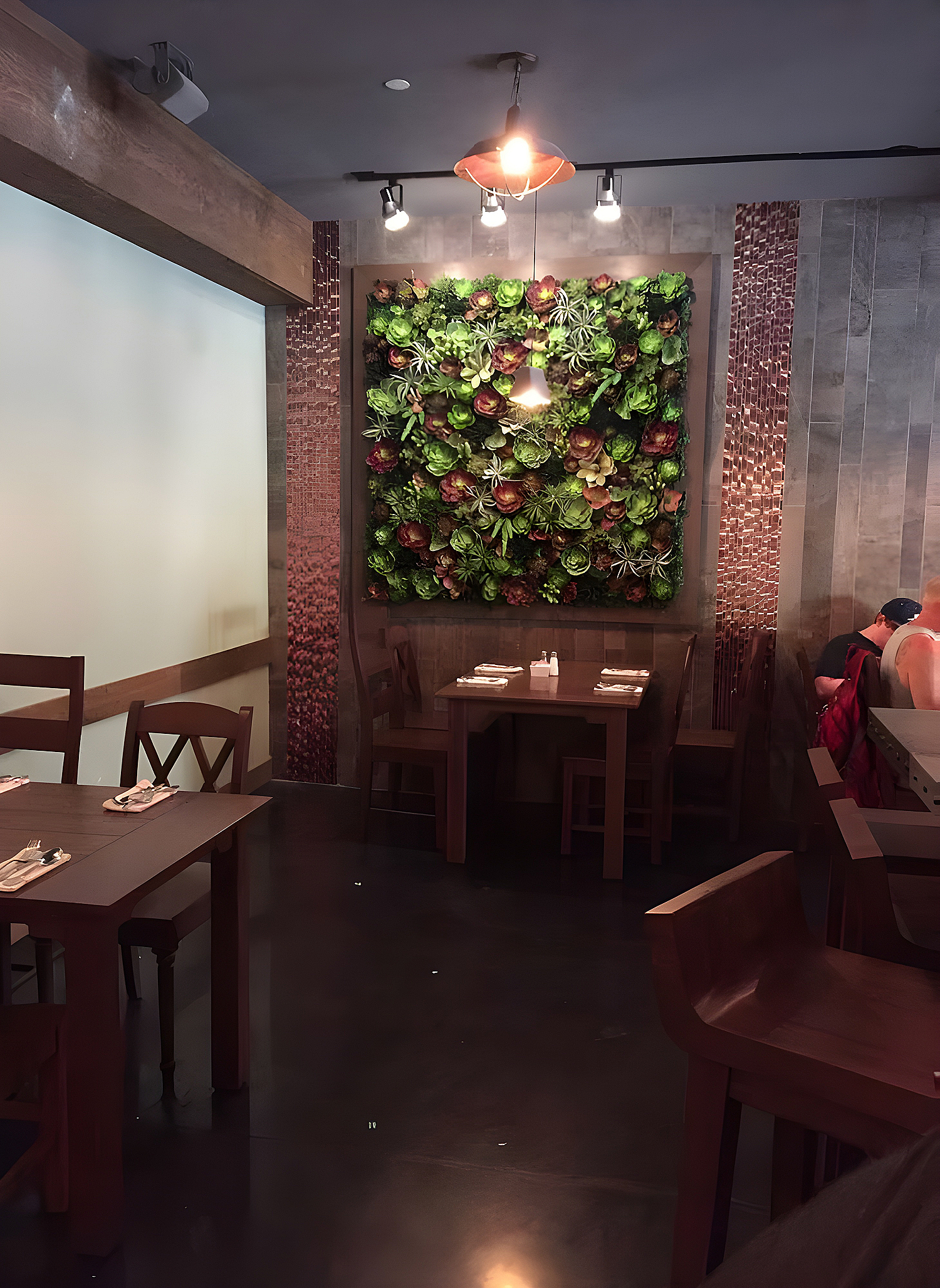 Creative Director Lara Hanneman aimed to revitalize the space with a contemporary feel while staying true to the park’s Western roots. Our solution: custom faux succulent wall décor. These large-scale installations, crafted with hyper-realistic succulents in earthy greens and purples, brought vibrant texture to the restaurant’s wood-paneled walls - bridging rustic charm with modern style.