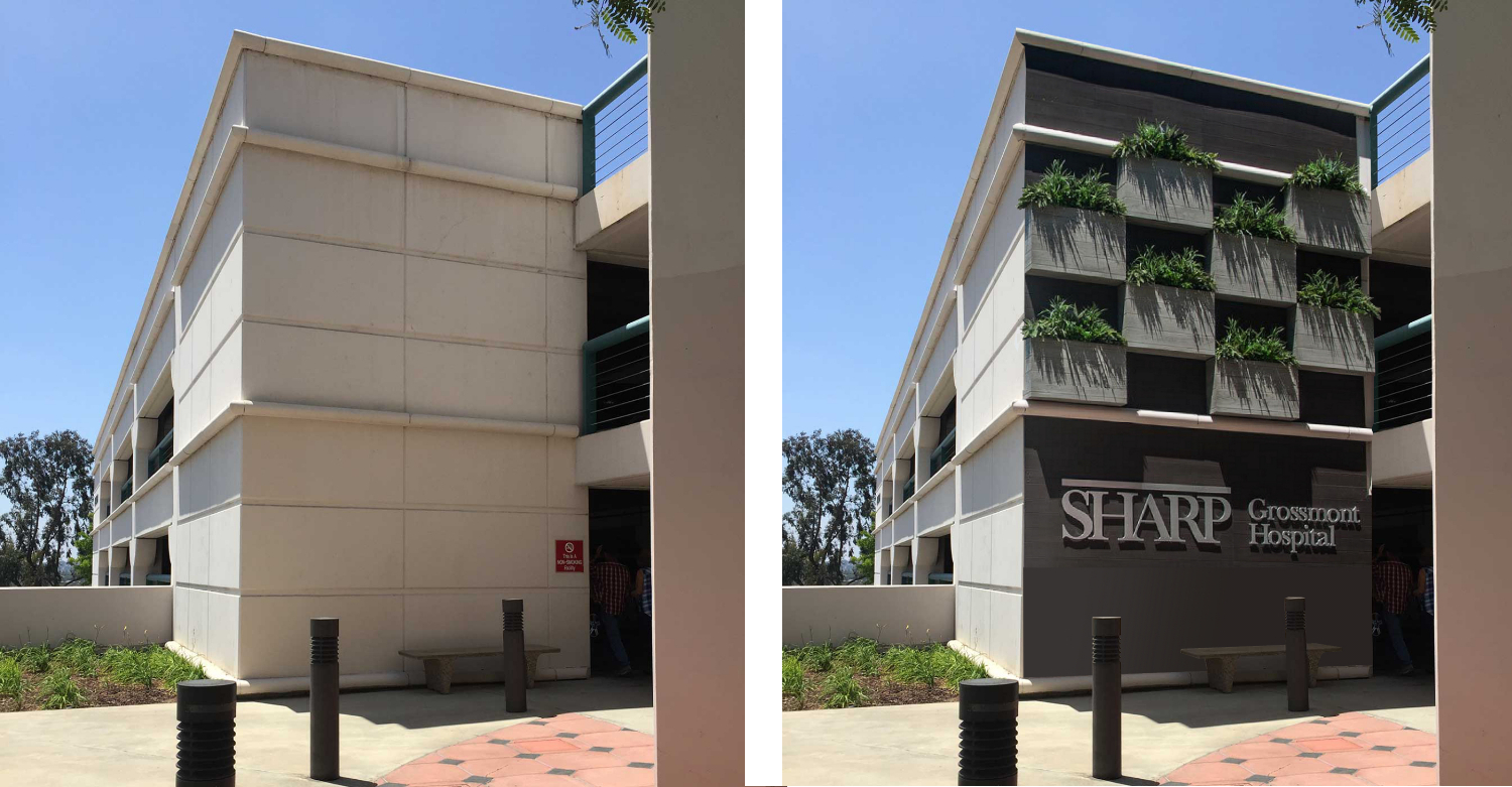 When Sharp Grossmont Hospital set out to update the façade of its multi-level parking garage - a prominent structure visible to patients, staff, and visitors daily - they brought in Artificial Plants Unlimited to help deliver a design solution that would elevate the space while aligning with the hospital’s modern architecture. Recognizing the importance of first impressions, the goal was to transform a utilitarian surface into a warm, welcoming, and brand-conscious feature that felt integrated into the overall campus aesthetic.